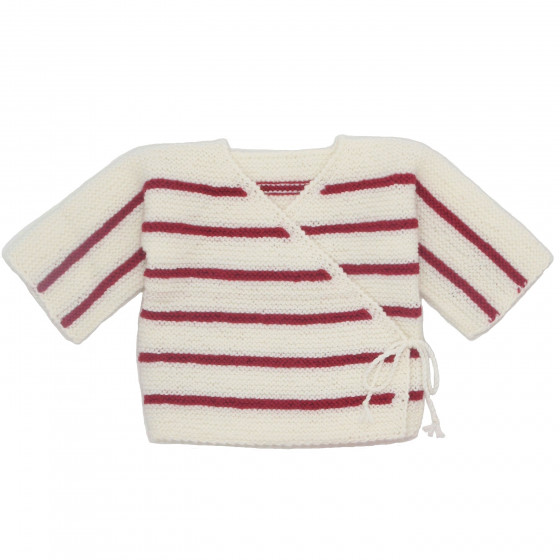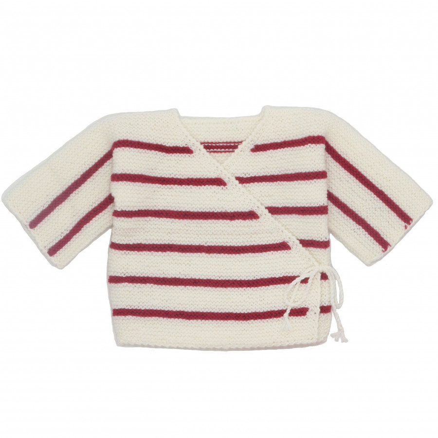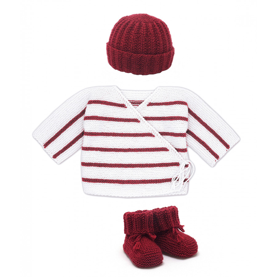 Ensemble 3 pièces petit matelot, blanc rayé rouge, demandé dans tout trousseau de maternité, tricoté à la main par nos mamies tricoteuses françaises, en 100% laine mérinos douce et chaude. Marque Mamy Buzzy