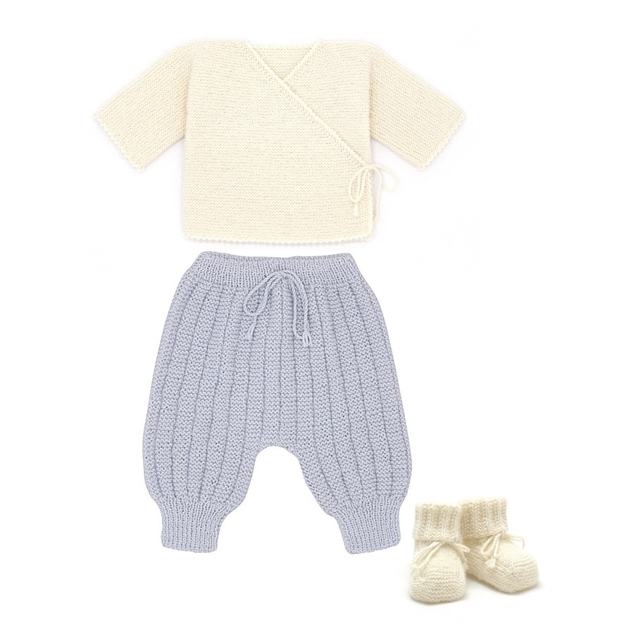 Une superbe tenue de naissance bien chaude. Tricotée avec grand soin en 100% laine mérinos. Une brassière ivoire et chaussons assortis, sur un pantalon sarouel gris clair.